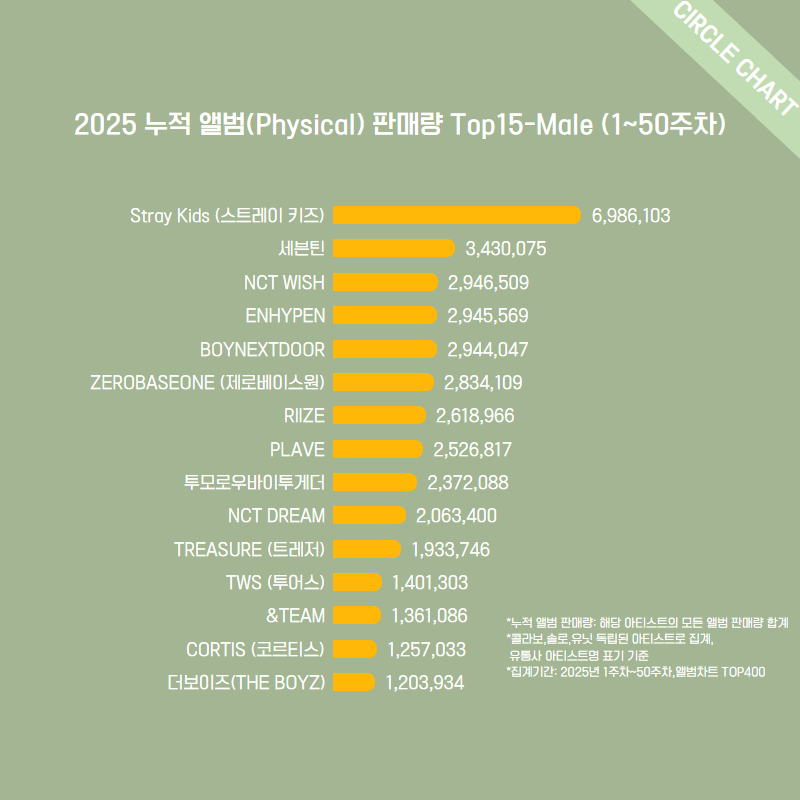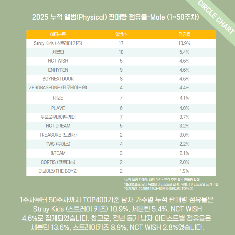 1주차부터 50주차까지 TOP400기준 남자 가수별 누적 판매량 점유율은 Stray Kids (스트레이 키즈) 10.9%, 세븐틴 5.4%, NCT WISH 4.6%로 집계되었습니다. 참고로, 전년 동기 남자 아티스트별 점유율은 세븐틴 13.6%, 스트레이키즈 8.9%, NCT WISH 2.8%였습니다.