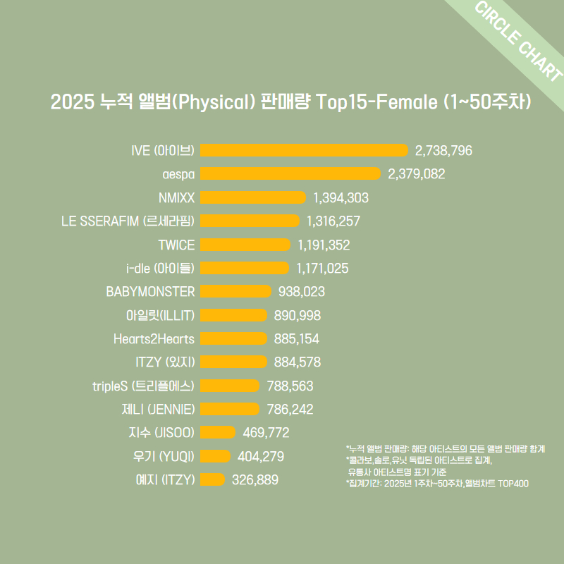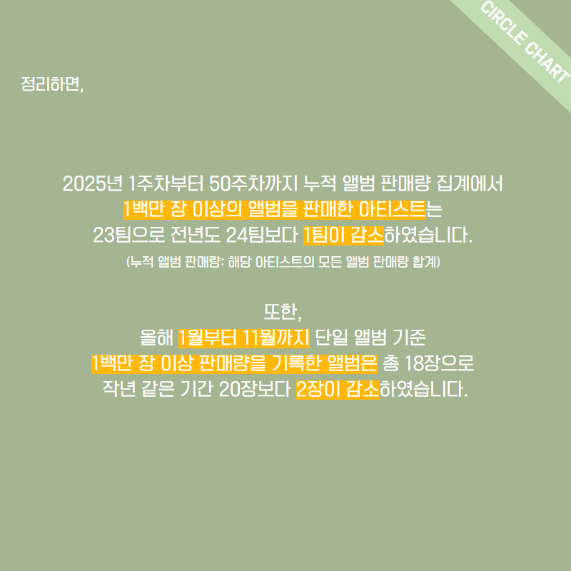 2025년 1주차부터 50주차까지 누적 앨범 판매량 집계에서 1백만 장 이상의 앨범을 판매한 아티스트는 23팀으로 전년도 24팀보다 1팀이 감소하였습니다.