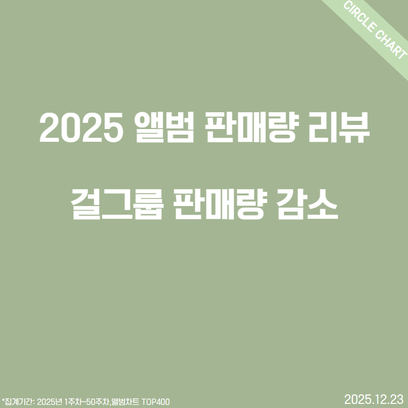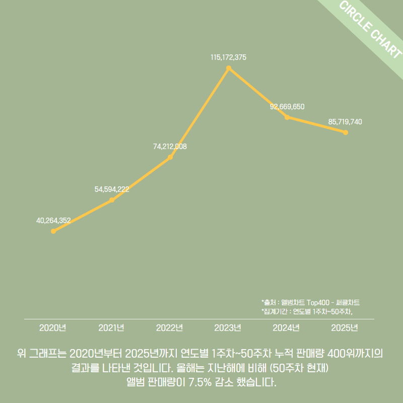 위 그래프는 2020년부터 2025년까지 연도별 1주차~50주차 누적 판매량 400위까지의 결과를 나타낸 것입니다. 올해는 지난해에 비해 (50주차 현재) 앨범 판매량이 7.5% 감소했습니다.