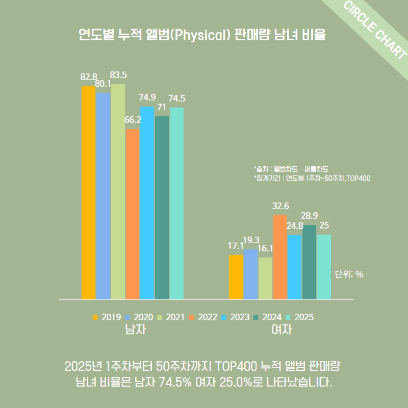 2025년 1주차부터 50주차까지 TOP400 누적 앨범 판매량 남녀 비율은 남자 74.5% 여자 25.0%로 나타났습니다.