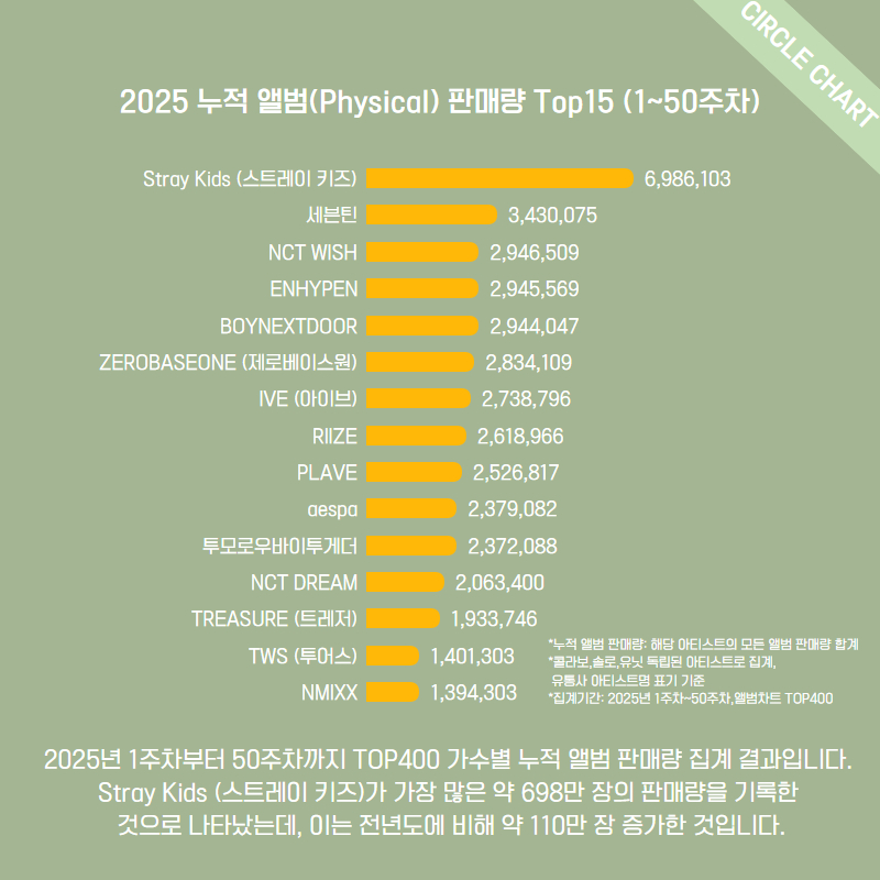 2025년 1주차부터 50주차까지 TOP400 가수별 누적 앨범 판매량 집계 결과입니다. Stray Kids (스트레이 키즈)가 가장 많은 약 698만 장의 판매량을 기록한 것으로 나타났는데, 이는 전년도에 비해 약 110만 장 증가한 것입니다.