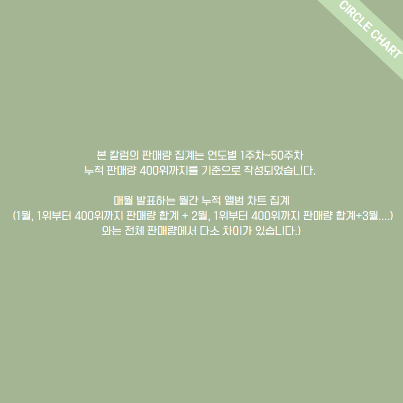 매월 발표하는 월간 누적 앨범 차트 집계(1월, 1위부터 400위까지 판매량 합계 + 2월, 1위부터 400위까지 판매량 합계+3월....)와는 전체 판매량에서 다소 차이가 있습니다.)