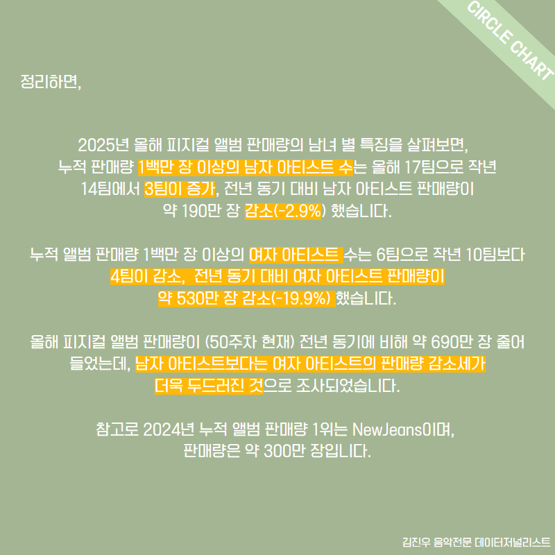 2025년 올해 피지컬 앨범 판매량의 남녀 별 특징을 살펴보면, 누적 판매량 1백만 장 이상의 남자 아티스트 수는 올해 17팀으로 작년 14팀에서 3팀이 증가, 전년 동기 대비 남자 아티스트 판매량이 약 190만 장 감소(-2.9%) 했습니다.