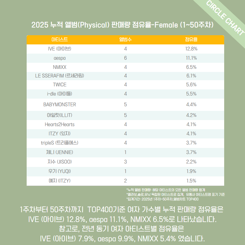 1주차부터 50주차까지 TOP400기준 여자 가수별 누적 판매량 점유율은 IVE (아이브) 12.8%, aespa 11.1%, NMIXX 6.5%로 나타났습니다. 참고로, 전년 동기 여자 아티스트별 점유율은 IVE (아이브) 7.9%, aespa 9.9%, NMIXX 5.4% 였습니다.