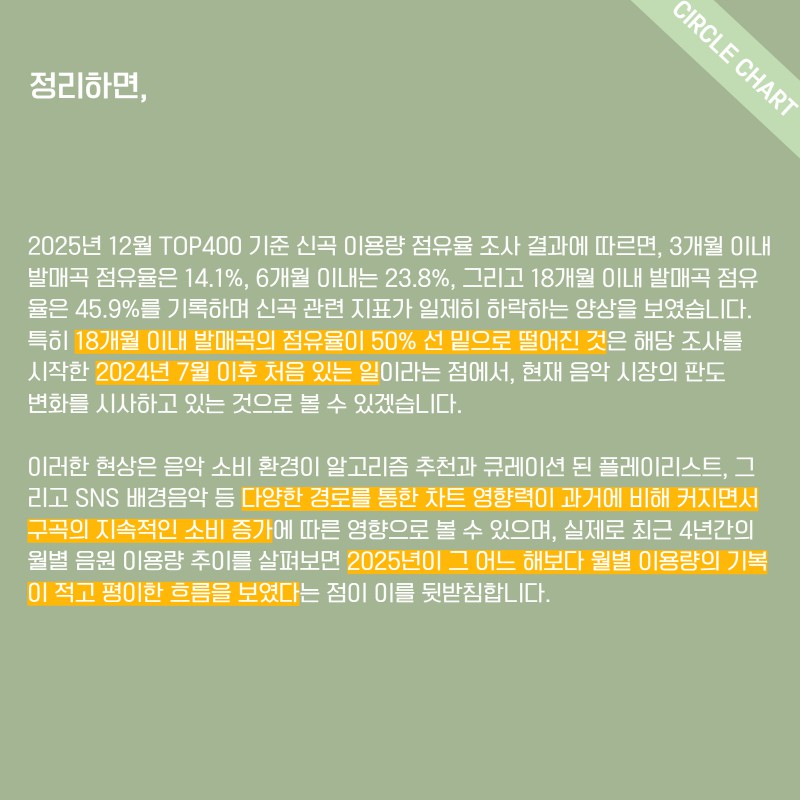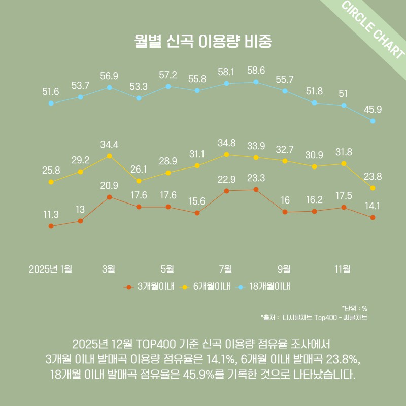 2025년 12월 TOP400 기준 신곡 이용량 점유율 조사에서 3개월 이내 발매곡 이용량 점유율은 14.1%, 6개월 이내 발매곡 23.8%,18개월 이내 발매곡 점유율은 45.9%를 기록한 것으로 나타났습니다.