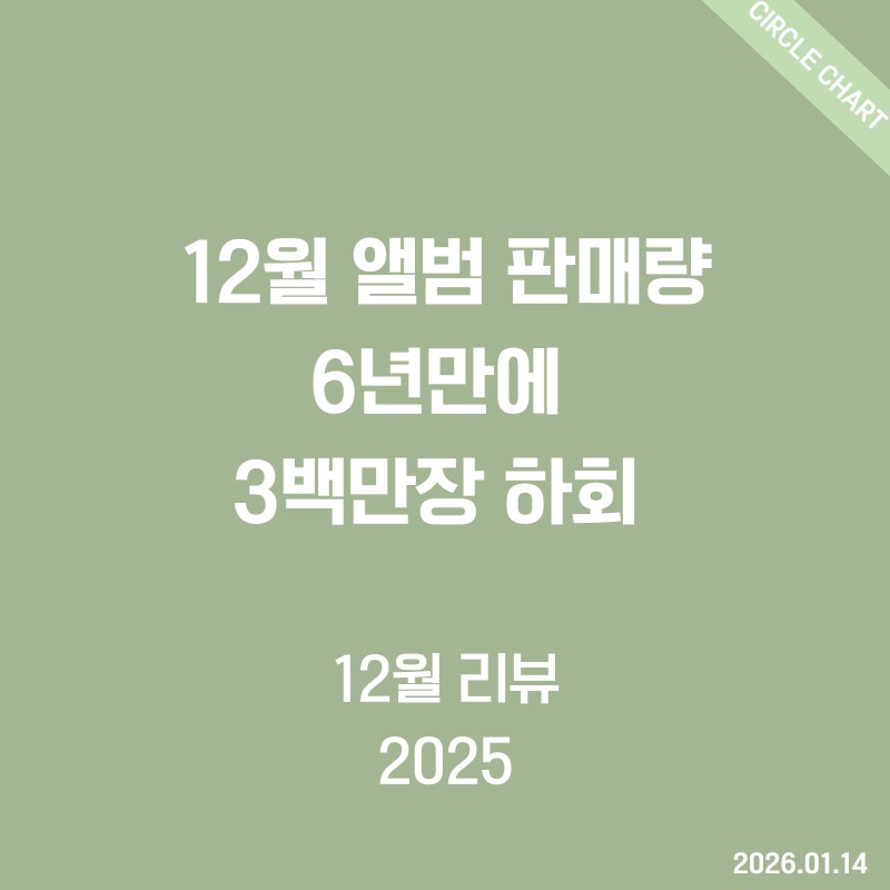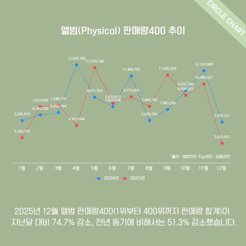 2025년 12월 앨범 판매량400(1위부터 400위까지 판매량 합계)이 지난달 대비 74.7% 감소, 전년 동기에 비해서는 51.3% 감소했습니다.