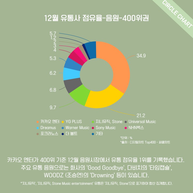 카카오 엔터가 400위 기준 12월 음원시장에서 유통 점유율 1위를 기록했습니다. 주요 유통 음원으로는 화사의 'Good Goodbye', 다비치의 '타임캡슐', WOODZ (조승연)의 'Drowning' 등이 있습니다.