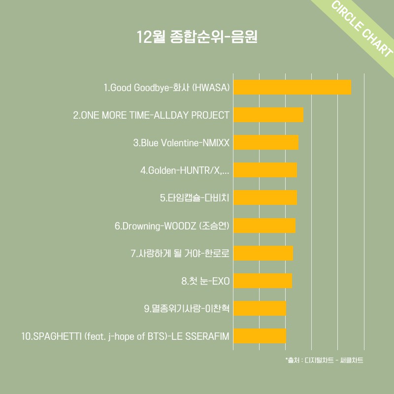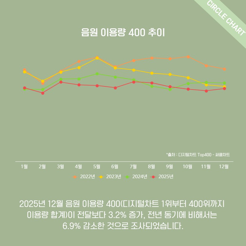 2025년 12월 음원 이용량 400(디지털차트 1위부터 400위까지 이용량 합계)이 전달보다 3.2% 증가, 전년 동기에 비해서는 6.9% 감소한 것으로 조사되었습니다.