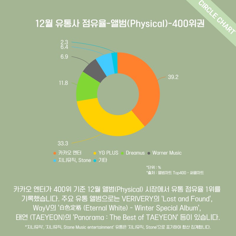 카카오 엔터가 400위 기준 12월 앨범(Physical) 시장에서 유통 점유율 1위를 기록했습니다. 주요 유통 앨범으로는 VERIVERY의 'Lost and Found', WayV의 '白色定格 (Eternal White) - Winter Special Album', 태연 (TAEYEON)의 'Panorama : The Best of TAEYEON' 등이 있습니다.