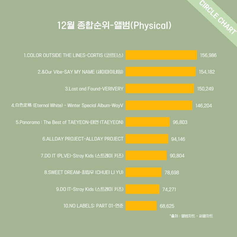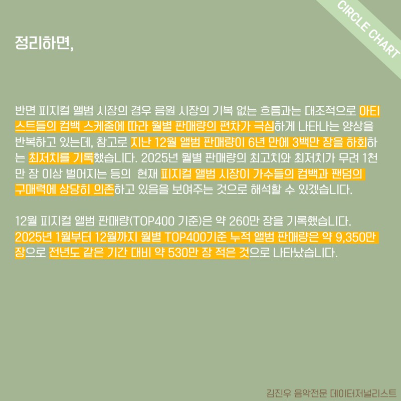 12월 피지컬 앨범 판매량(TOP400 기준)은 약 260만 장을 기록했습니다. 2025년 1월부터 12월까지 월별 TOP400기준 누적 앨범 판매량은 약 9,350만 장으로 전년도 같은 기간 대비 약 530만 장 적은 것으로 나타났습니다.