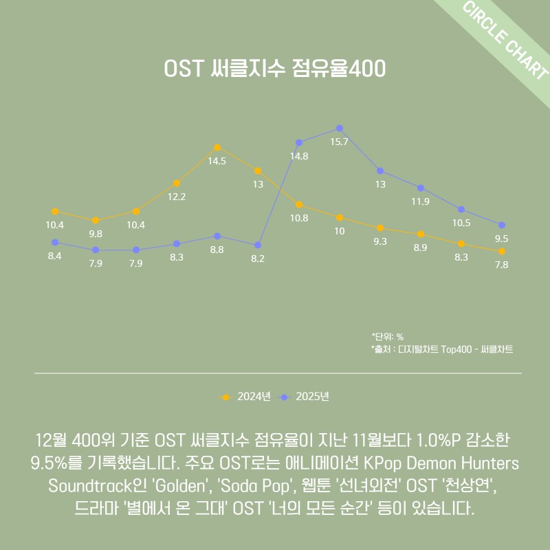 12월 400위 기준 OST 써클지수 점유율이 지난 11월보다 1.0%P 감소한 9.5%를 기록했습니다. 주요 OST로는 애니메이션 KPop Demon Hunters Soundtrack인 'Golden', 'Soda Pop', 웹툰 '선녀외전' OST '천상연', 드라마 '별에서 온 그대' OST '너의 모든 순간' 등이 있습니다.