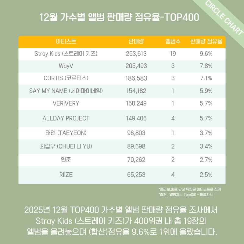 2025년 12월 TOP400 가수별 앨범 판매량 점유율 조사에서 Stray Kids (스트레이 키즈)가 400위권 내 총 19장의 앨범을 올려놓으며 (합산)점유율 9.6%로 1위에 올랐습니다.
